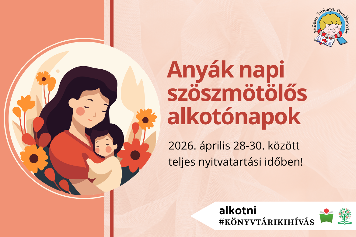 Gyerekkönyvtár Program Apr 08 / 0 Hozzászólások Anyák napi szöszmötölő Helyszín: Központi könyvtár (Fő tér 2.) Időpont: 2026. április 28., kedd – 09:00 2026. április 28-30. között teljes nyitvatartási időben várjuk a családokat Anyák napi szöszmötölő foglalkozásra, ahol az ünnephez kapcsolódó ajándékokat készítjük el közösen. „Ami csak szép s jó volna Édesanyámnak adnám” Létay Lajos Hasonló tartalmak Gyalogbéka témahét Gyerekkönyvtár Hír Apr 08 Mesesarok: Demeter Lázár Katalin Gyerekkönyvtár Hír Apr 08 Csupafül kutyafül hangos olvasást segítő tréning Gyerekkönyvtár Hír Program Mar 31 Rengeteg brekeke szöszmötölő Gyerekkönyvtár Hír Mar 12 Mesekarnevál 2026 Gyerekkönyvtár Hír Mar 05 2025 legtöbbet kölcsönzött gyerekkönyvei Gyerekkönyvtár Hír Jan 27
