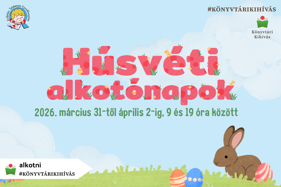 Gyerekkönyvtár Hír Mar 31 / 0 Hozzászólások Húsvéti alkotónapok Helyszín: Központi könyvtár (Fő tér 2.) 2026. március 31-től április 2-ig, szöszmötölni várjuk a családokat teljes nyitvatartási időben (keddtől csütörtökig 9:00-19:00) a József Attila Könyvtár gyerekkönyvtárában! A program ingyenes. Hasonló tartalmak Kicsinyeink nagy lépése Gyerekkönyvtár Hír Apr 28 Hamarosan lezárul az olvasópályázat! Gyerekkönyvtár Hír Apr 15 Gyalogbéka témahét Gyerekkönyvtár Hír Apr 08 Mesesarok: Demeter Lázár Katalin Gyerekkönyvtár Hír Apr 08 Rengeteg brekeke szöszmötölő Gyerekkönyvtár Hír Mar 12 Mesekarnevál 2026 Gyerekkönyvtár Hír Mar 05