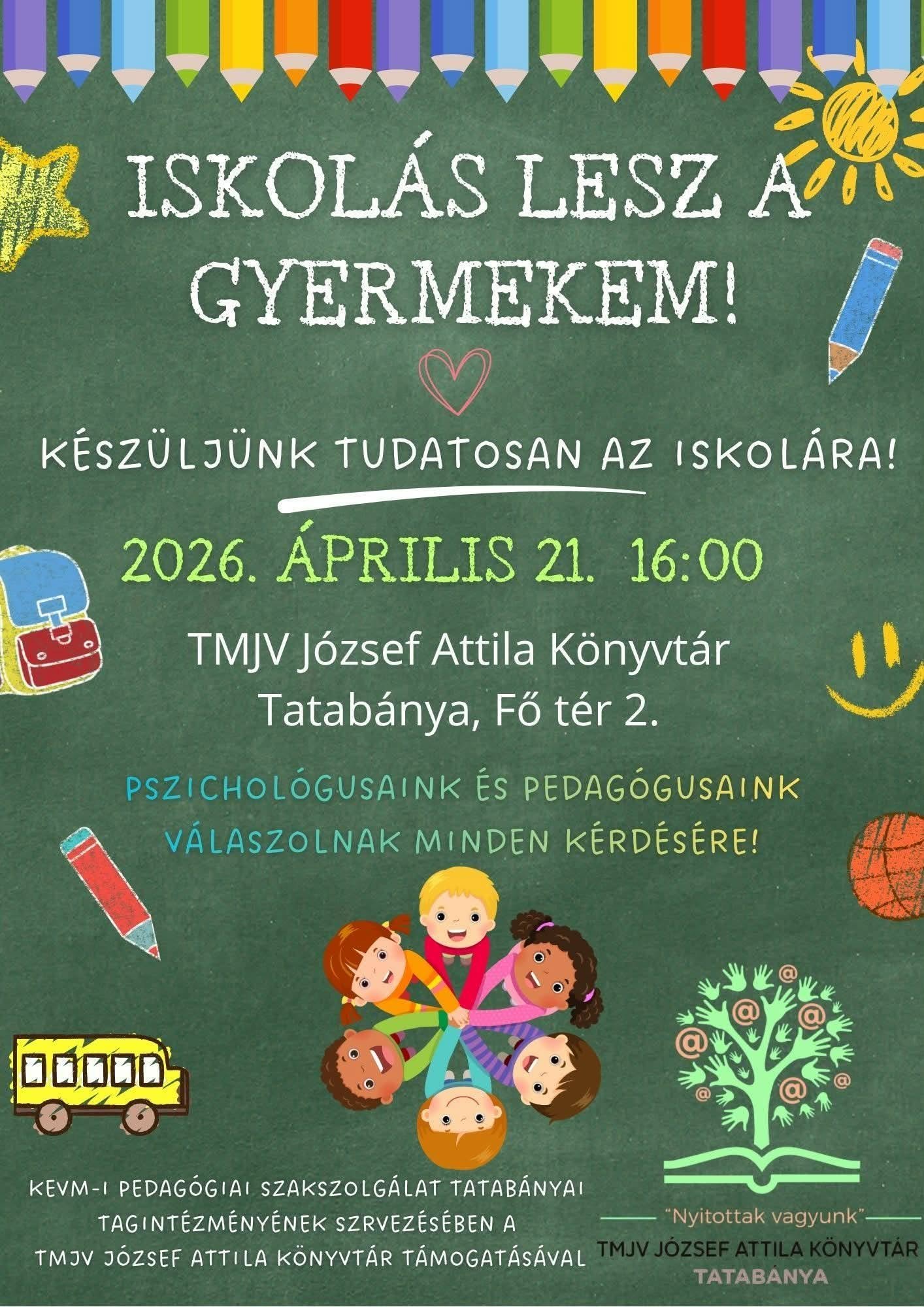 Gyerekkönyvtár Program Apr 17 / 0 Hozzászólások Iskolás lesz a gyermekem! Helyszín: Központi könyvtár (Fő tér 2.) Időpont: 2026. április 21., kedd – 16:00 Kedves Szülők! Iskolás lesz a gyermekük? A KEVM-i Pedagógiai Szakszolgálat szervezésében szeretettel várjuk Önöket 2026. április 21-én 16 órától! Pszichológusaik és pedagógusaik minden felmerülő kérdésüket megválaszolják! Hasonló tartalmak Hamarosan lezárul az olvasópályázat! Gyerekkönyvtár Hír Apr 15 Gyalogbéka témahét Gyerekkönyvtár Hír Apr 08 Mesesarok: Demeter Lázár Katalin Gyerekkönyvtár Hír Apr 08 Csupafül kutyafül hangos olvasást segítő tréning Gyerekkönyvtár Hír Mar 31 Húsvéti alkotónapok Gyerekkönyvtár Hír Mar 31 Rengeteg brekeke szöszmötölő Gyerekkönyvtár Hír Mar 12