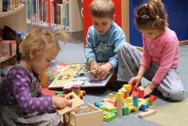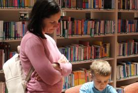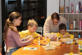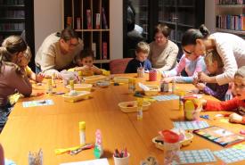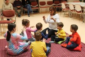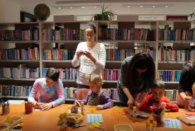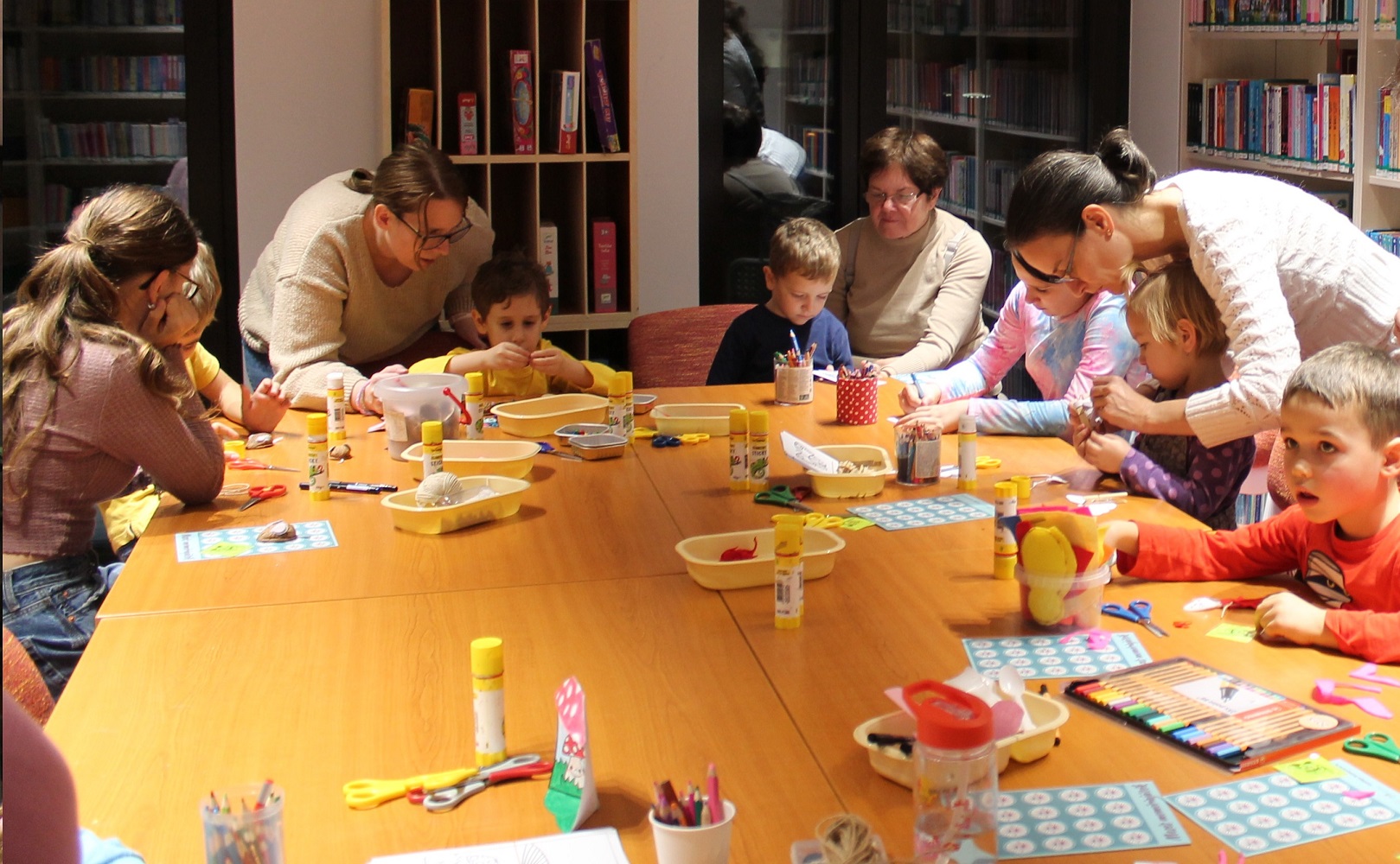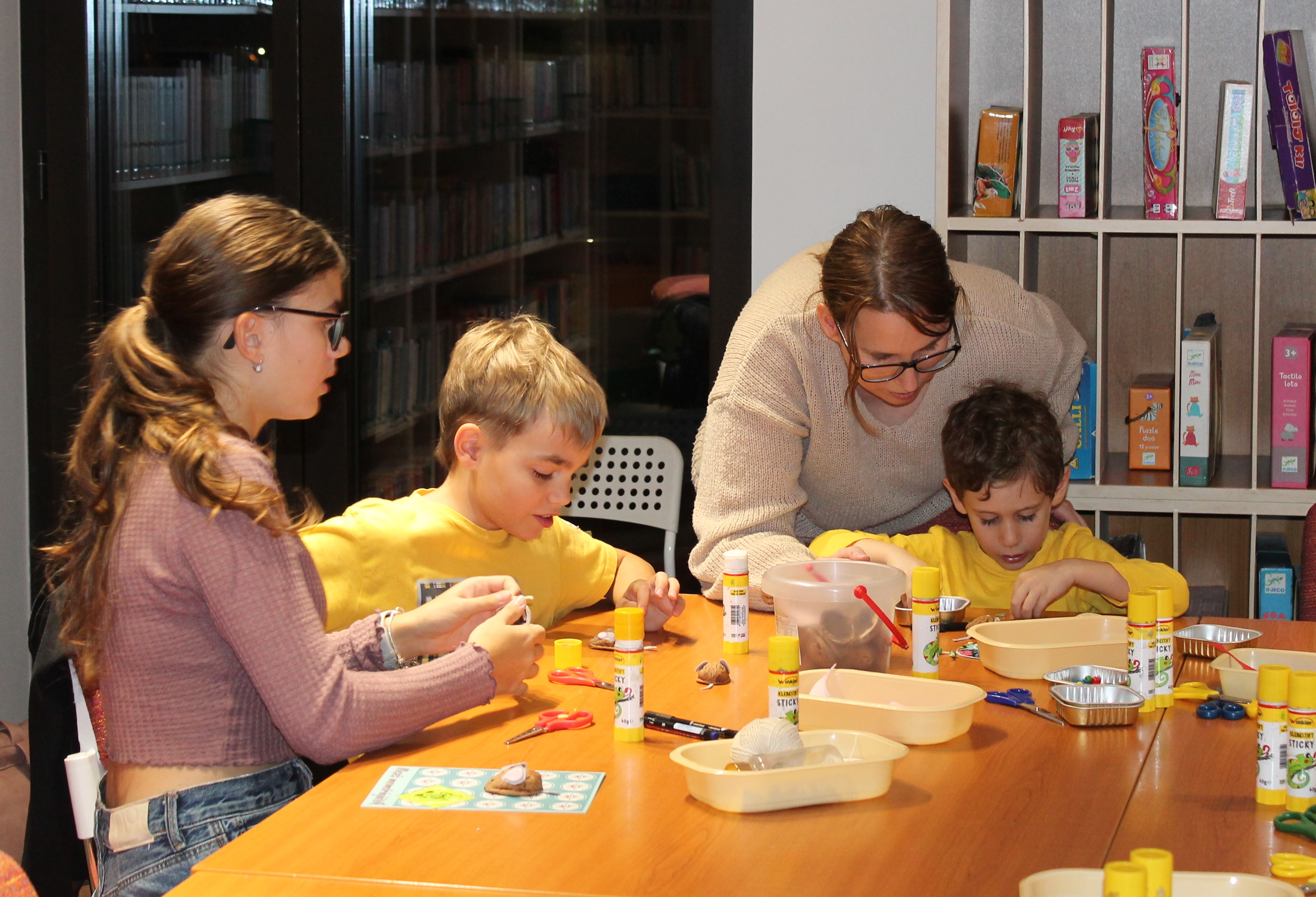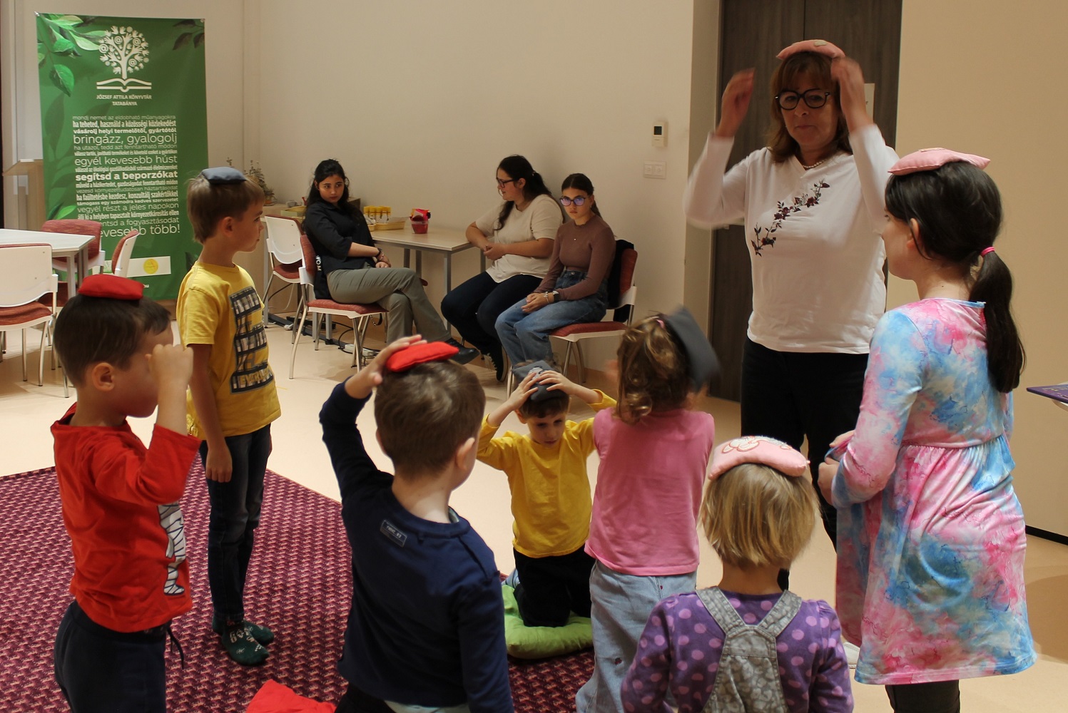 Juli néni, aki mozgásterapeuta és óvodapedagógus, A gomba alatt című mesével, bábokkal és sok-sok mozgásos játékkal érkezett. Jó mulatság volt! A gyerekek ugrottak, mint a nyuszi, röpködtek, mint a pillangó, nőttek, mint a gomba, aztán jól megérdemelt pihenésképpen alkottak a gyerekkönyvtárban. Volt ott mindenféle cukiság a dióbél egérkétől a csipeszpillangóig és a kanálnyusziig.
