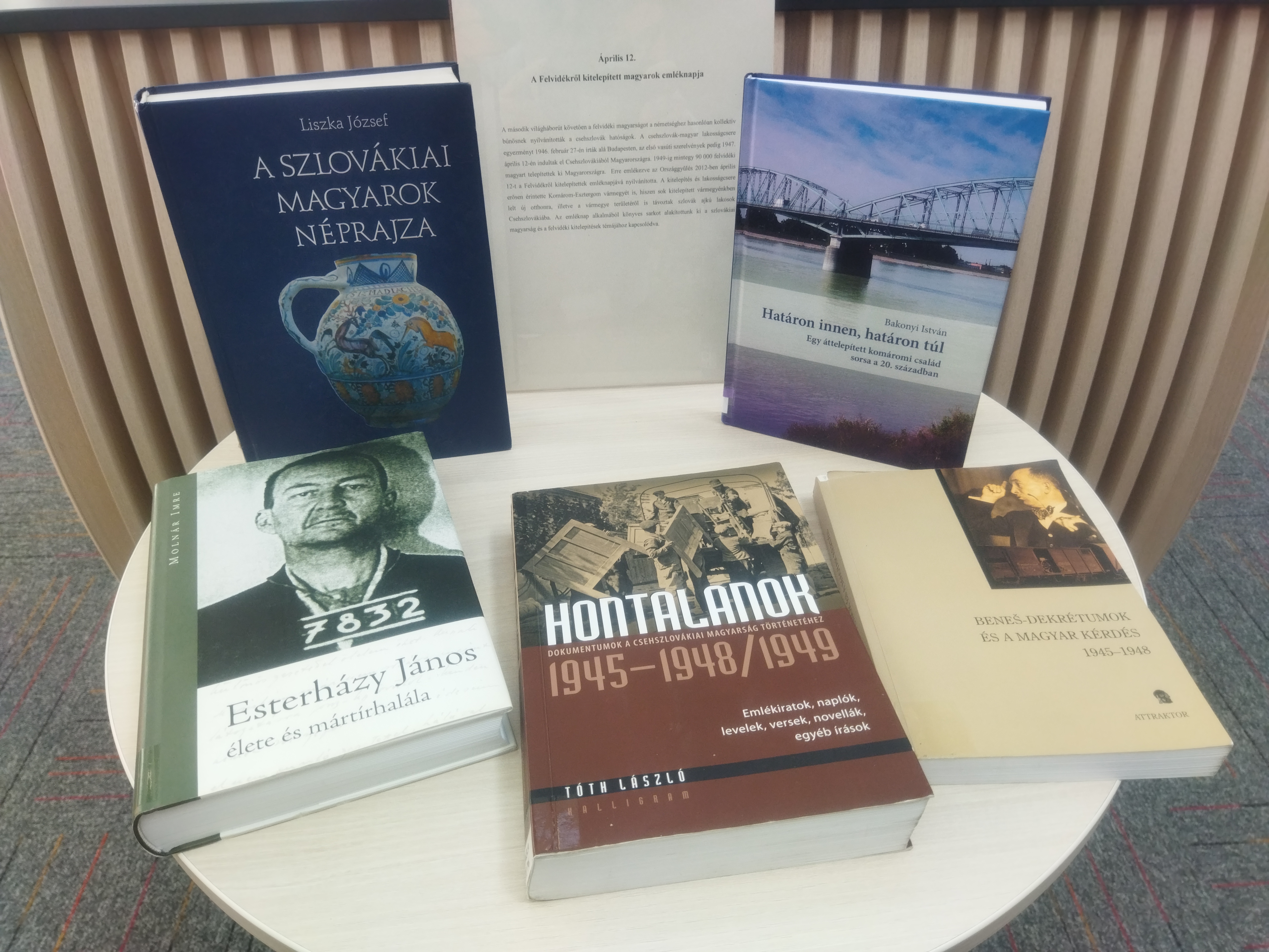 A második világháborút követően a felvidéki magyarságot a németséghez hasonlóan kollektív bűnösnek nyilvánították a csehszlovák hatóságok. A csehszlovák-magyar lakosságcsere egyezményt 1946. február 27-én írták alá Budapesten, az első vasúti szerelvények pedig 1947. április 12-én indultak el Csehszlovákiából Magyarországra. 1949-ig mintegy 90 000 felvidéki magyart telepítettek ki Magyarországra. Erre emlékezve az Országgyűlés 2012-ben április 12-t a Felvidékről kitelepítettek emléknapjává nyilvánította. A kitelepítés és lakosságcsere erősen érintette Komárom-Esztergom vármegyét is, hiszen sok kitelepített vármegyénkben lelt új otthonra, illetve a vármegye területéről is távoztak szlovák ajkú lakosok Csehszlovákiába. Az emléknap alkalmából könyves sarkot alakítottunk ki a szlovákiai magyarság és a felvidéki kitelepítések témájához kapcsolódva.