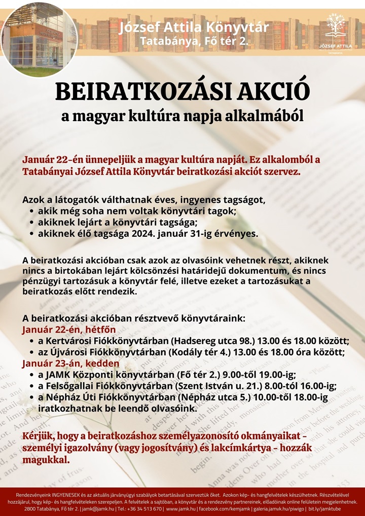 Január 22-én ünnepeljük a magyar kultúra napját. Ez alkalomból a Tatabányai József Attila Könyvtár beiratkozási akciót szervez.