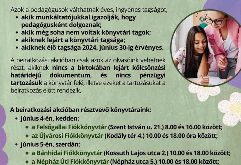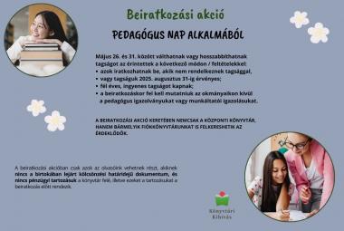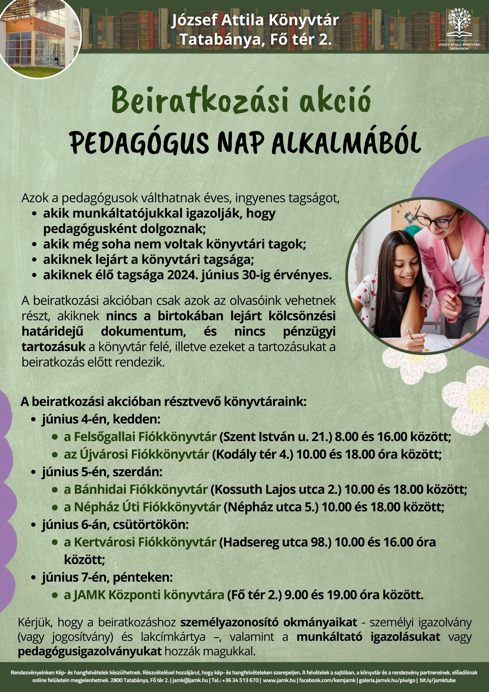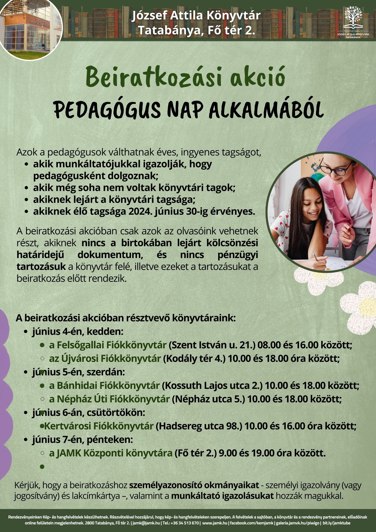 Minden év júniusának első vasárnapján ünnepeljük a pedagógusokat. 2024-ben ez a nap június 2-re esik. Ebből az alkalomból a József Attila Könyvtár június 4-e és június 7-e között beiratkozási akciót szervez.