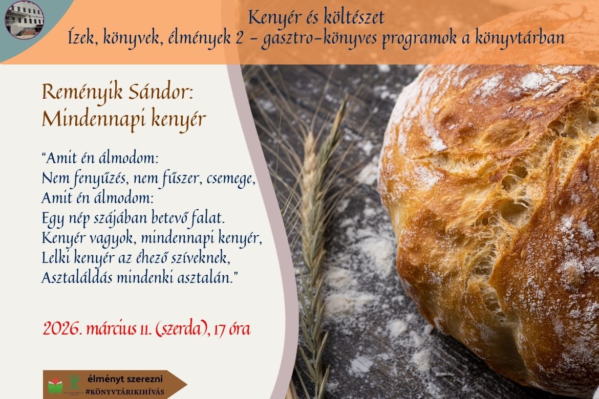 Hír Mar 06 / 0 Hozzászólások Ízek, könyvek, élmények - Kenyér és költészet - IDŐPONTVÁLTOZÁS Kedves Olvasóink! Az Ízek, könyvek élmények programsorozat márciusi Kenyér és költészet című rendezvénye március 11-én 17 órától kerül megrendezésre. Hasonló tartalmak Ajánljunk és olvassunk verseket! Hír Mar 06 Újra üzemel a könyvvisszavevő automata Hír Mar 05 Mesekarnevál 2026 Gyerekkönyvtár Hír Mar 05 Könyvtári bingó 2026 Hír Mar 04 Emlékmentő 04. – A város, mint mikrokozmosz Helyismeret Hír Mar 03 Márciusi programok Hír Mar 02