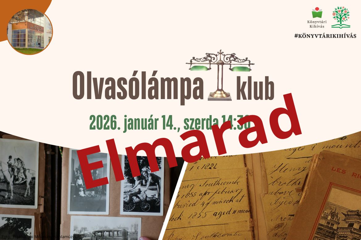 Hír Jan 13 / 0 Hozzászólások A januári Olvasólámpa Klub Tájékoztatjuk kedves olvasóinkat, hogy a 2026. január 14-i Olvasólámpa klub programja elmarad. Megértésüket köszönjük. Hasonló tartalmak E-book újdonságok Hír Jan 10 „Vess szép szemeket rája” – Népmese-konferencia Hír Program Jan 08 Emlékmentő 02. – Bányász identitás Helyismeret Hír Jan 08 Öko hírek 2026 január Zöldkönyvtár Hír Jan 08 Virtuális könyvtár – biztonságos olvasás a havazás idején is Hír Jan 07 A Tájoló könyvklub januári ajánlója Hír Jan 01
