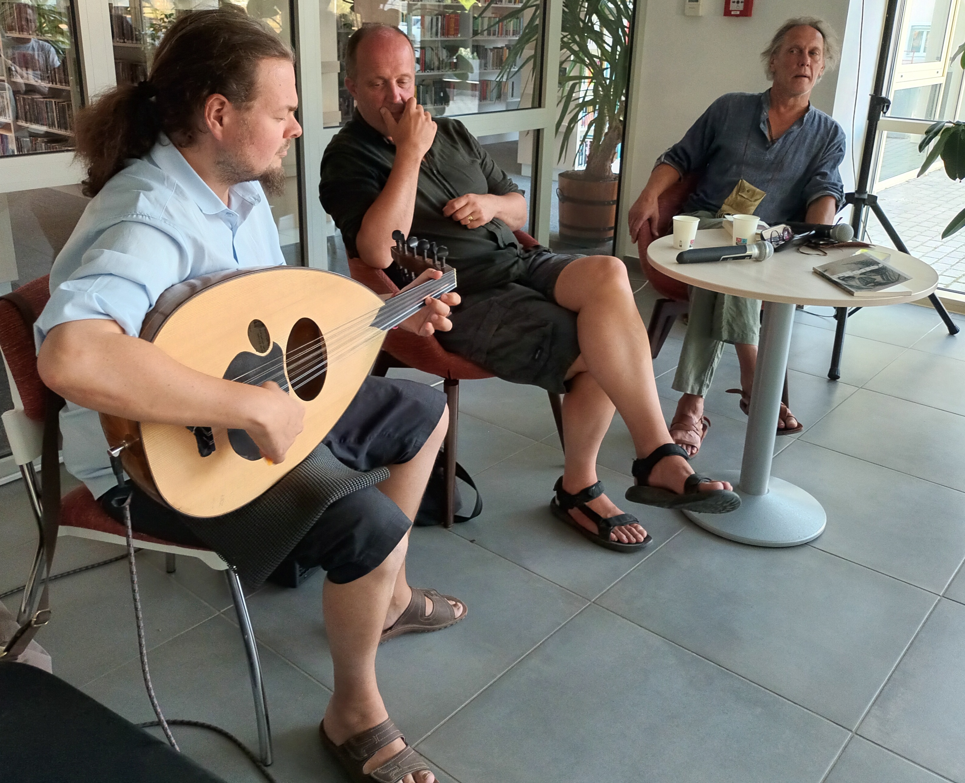 Természetesen az Új Forrás irodalmi folyóirat legutóbbi számának ismertetőjével indult a program. Ezúttal Krulik Zoltán olvasta fel egyik megjelent prózáját, majd Kobza Vajk lantjátéka után a kiváló zenésszel ismerkedhetett meg a hallgatóság. A régi korok zene-esztétikáját tanulmányozva, az orientális fúziós zene egyik hazai képviselője. Hazánkban javarészt a kevéssé ismert középkori, illetve keleti pengetős hangszereken játszik. Már gyerekkorától kezdve szoros kapcsolatba került a zenével, azonban később Anouar Brahem údművész játékát meghallva határozta el, hogy arab-lanton fog tanulni.