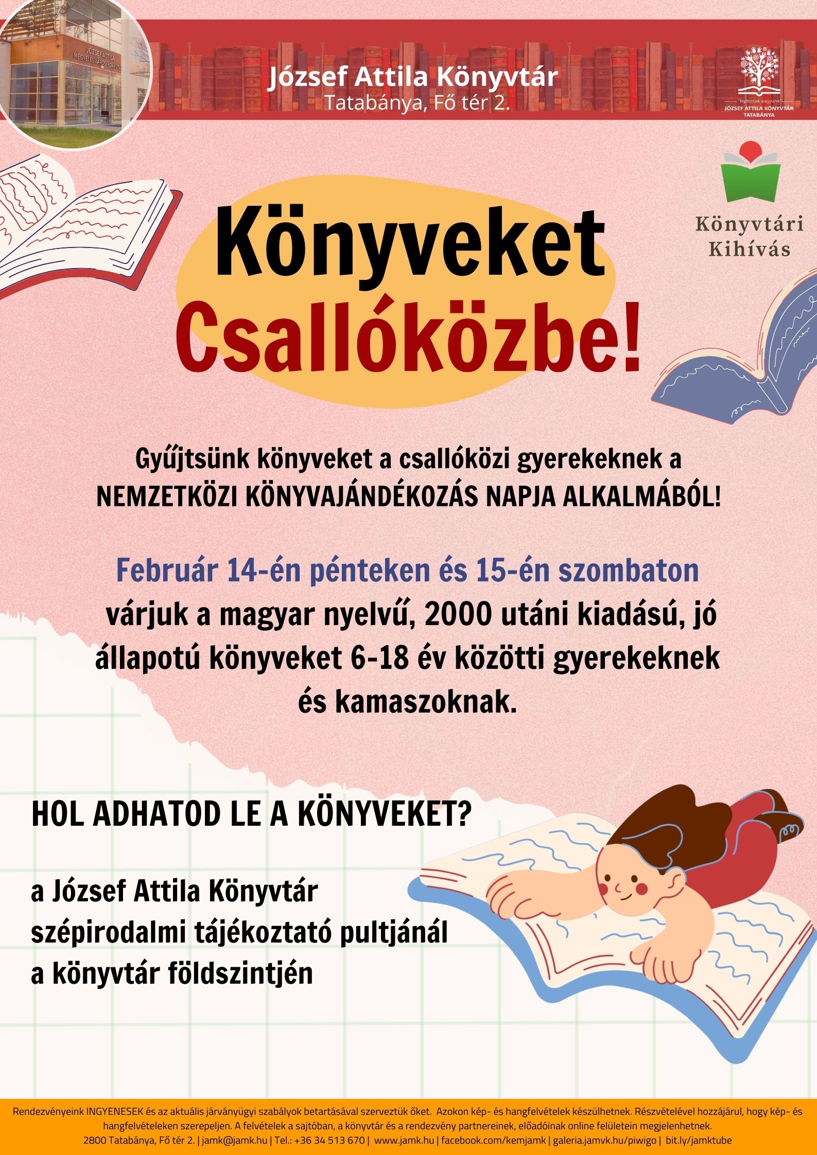 Február 14-én pénteken és 15-én szombaton központi könyvtárunkba (Tatabánya, Fő tér 2.) várjuk az olyan - használt, de jó állapotban lévő, magyar nyelvű, a kétezres években kiadott - könyveket amelyek a 6-18 év közötti gyerekeknek és kamaszoknak szólnak.
