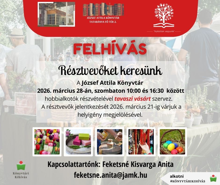 A József Attila Könyvtár 2026. március 28-án, szombaton 10:00 és 16:30 között hobbialkotók részvételével tavaszi vásárt szervez.