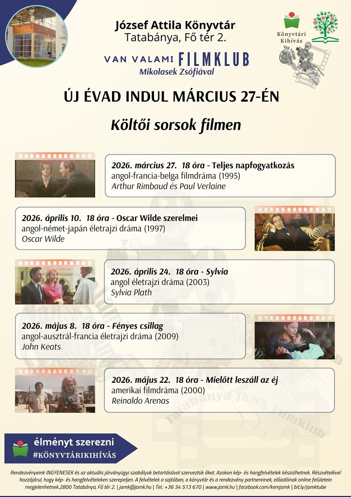 Új évaddal jelentkezik könyvtárunk népszerű filmklubja, a Van valami Filmklub. A március 27-én kezdődő évad témája: Költői sorsok filmen.