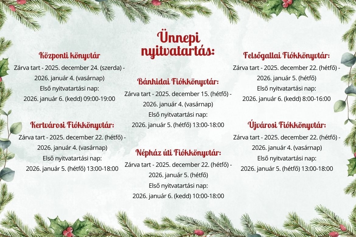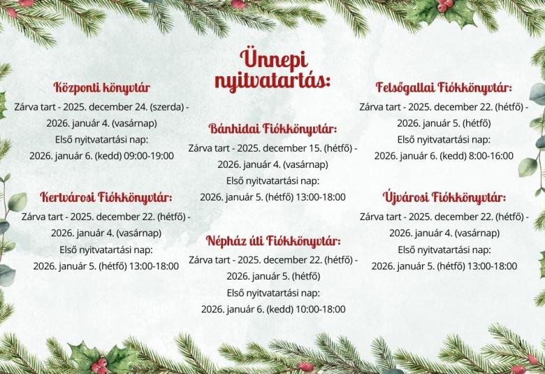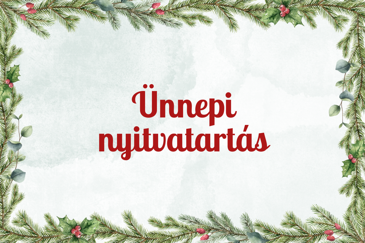 - Zárva tart - 2025. december 22. (hétfő) - 2026. január 5. (hétfő)