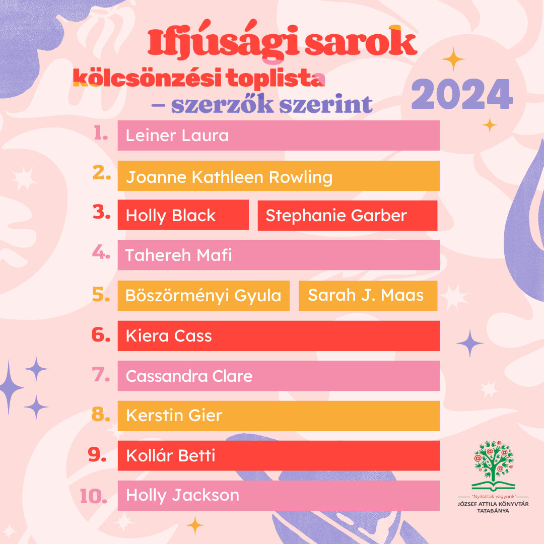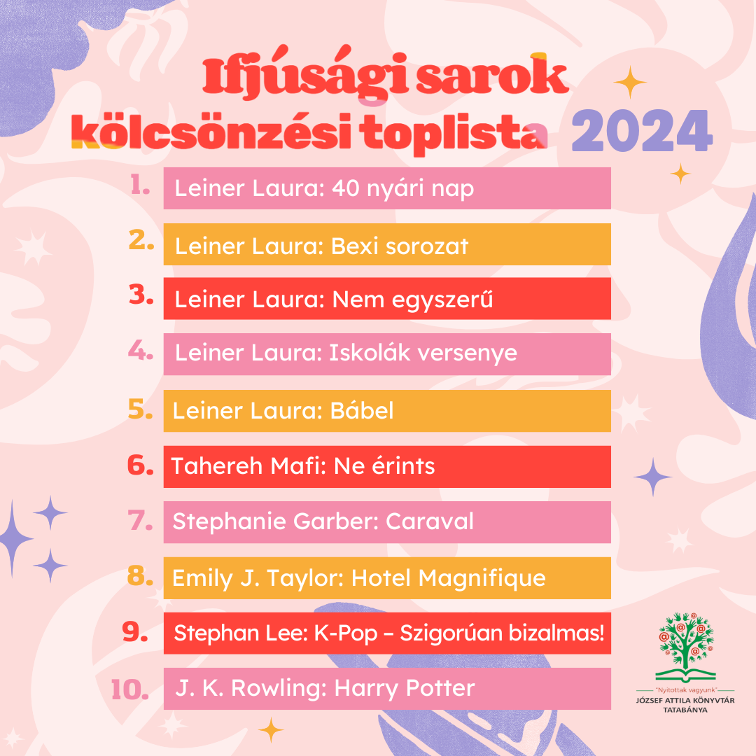 Listánkat a 2024-es év kölcsönzési adatai alapján állítottunk össze a felnőtt olvasótérben elhelyezkedő Ifjúsági sarok állományára vonatkozóan.