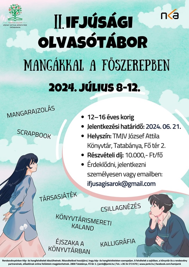 2024. július 8-12. között megrendezésre kerülő napközis táborunkba várjuk az olvasni és alkotni szerető 12-16 éves fiatalokat!