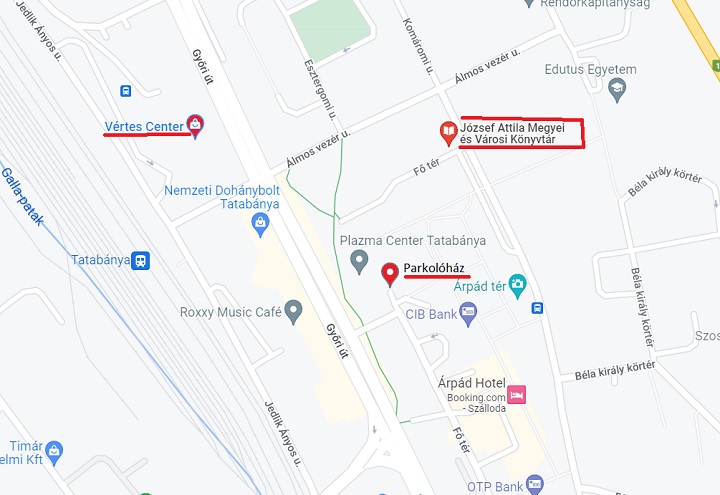 Parkolási lehetőség a Vértes Centerben vagy a Fő téri parkolóházban (Városkapu Szolgáltató és Üzletház).