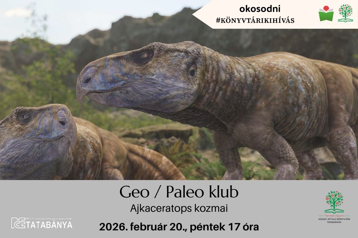 Program Jan 29 / 0 Hozzászólások Geo/Paleo klub Helyszín: Központi könyvtár (Fő tér 2.) Időpont: 2026. február 20., péntek – 17:00 A Geo/Paleo Klub legközelebbi találkozóját 2026. február 20-án, pénteken tartjuk. Az alkalom középpontjában ezúttal az őslénytan áll. Számvéber Tamás Ferenc előadásában a bakonyi dinót, az Ajkaceratops kozmait ismerhetik meg a résztvevők. Hasonló tartalmak JAT-Klub: Egész napos játék Program Jan 22 JAM Klub Program Jan 22 Lélekpihenő – zentangle firkarajzos foglalkozás Program Jan 22 Mesesarok Gyerekkönyvtár Program Jan 16 Tájoló könyvklub Program Dec 16 Dúdoló - zenebölcsi Sinka Melindával Gyerekkönyvtár Program Dec 13