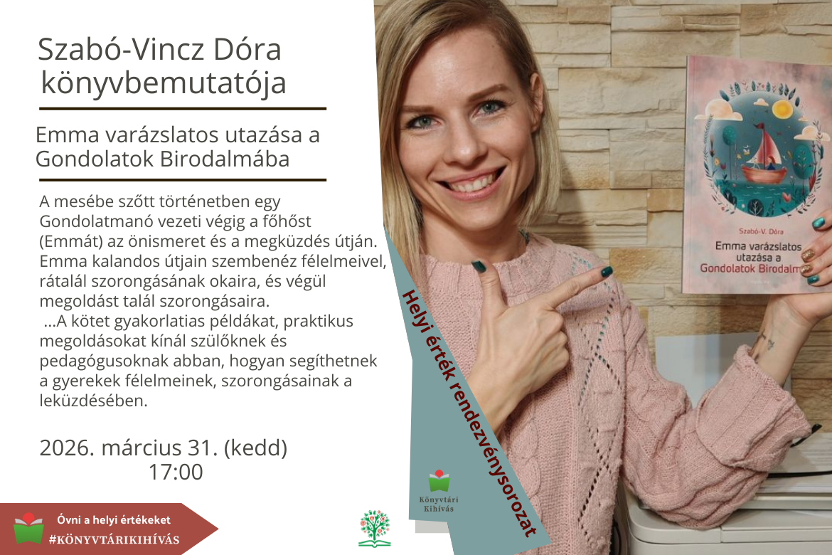A József Attila Könyvtár helyi érték programsorozat meghívott vendége Szabó-Vincz Dóra írónő. Legújabb könyvéről tart előadást, mely kifejezetten gyerekeknek és szüleiknek szól.