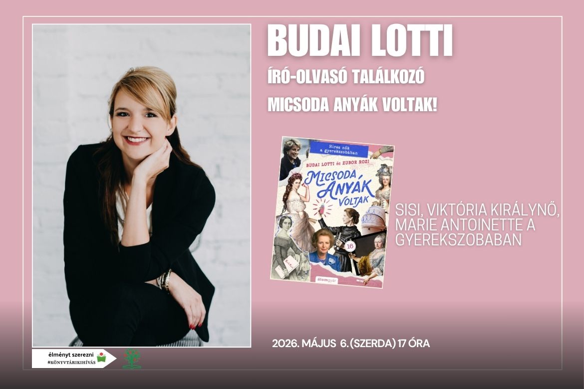 Szeretettel várunk minden érdeklődőt 2026. május 6-án 17 órától kezdődő író-olvasó találkozóra. Meghívott vendégünk Budai Lotti írónő érkezik hozzánk a „Micsoda anyák voltak” című előadásával, anyák napja alkalmából.