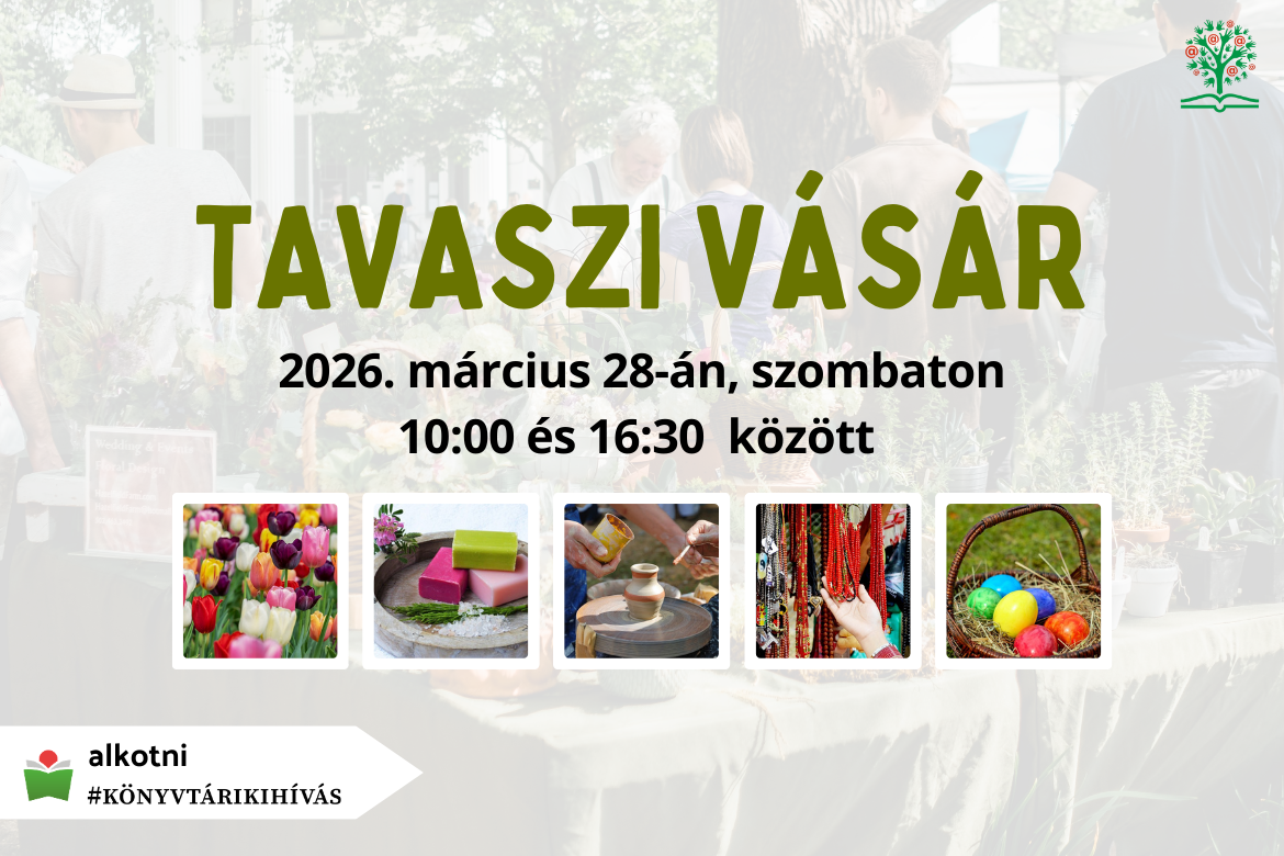 Program Mar 06 / 0 Hozzászólások Tavaszi kézműves vásár Helyszín: Központi könyvtár (Fő tér 2.) Időpont: 2026. március 28., szombat – 10:00 Tavaszi kézműves vásárral várjuk az érdeklődőket március 28-án, szombaton 10:00-16:30-ig. Hasonló tartalmak BETELT! Grecsó Krisztián: Üzenetek a múltból és jelenből Hír Program Feb 24 Tatabányai NetNagyi klub Program Mar 06 UFO Nyitott rezervátum - Beszélgetés Keresztes Zoltánnal Program Mar 06 Geo/Paleo klub - A folyók Program Mar 06 Ősz és tavasz között - Orcsik Zsuzsanna fotókiállítása Program Feb 24 BETELT! Grecsó Krisztián: Üzenetek a múltból és jelenből Hír Program Feb 24
