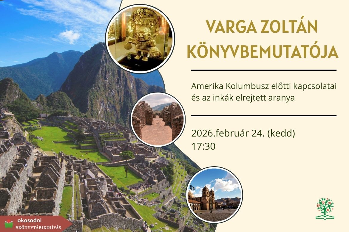 Szeretettel várja olvasóit a József Attila Könyvtár 2026. február 24.-én 17:30 kezdödő öko-est programjára. Az előadást Varga Zoltán geológus tartja, aki a dél-amerikai ősi kultúrák nagy tisztelője és már hat alkalommal járt Ecuadorban és Peruban.