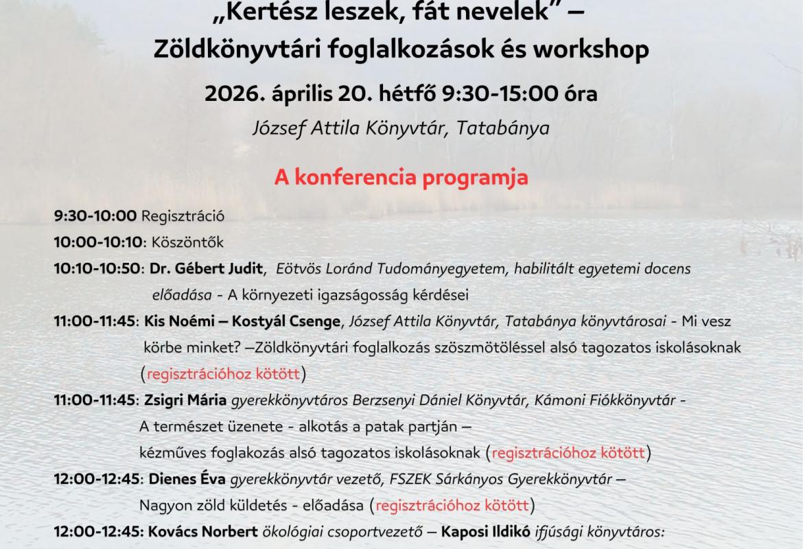A tatabányai József Attila Könyvtár szeretettel meghívja az érdeklődőket a "Kertész leszek fát nevelek" - Zöldkönyvtári foglalkozások és workshop című szakmai rendezvényre.