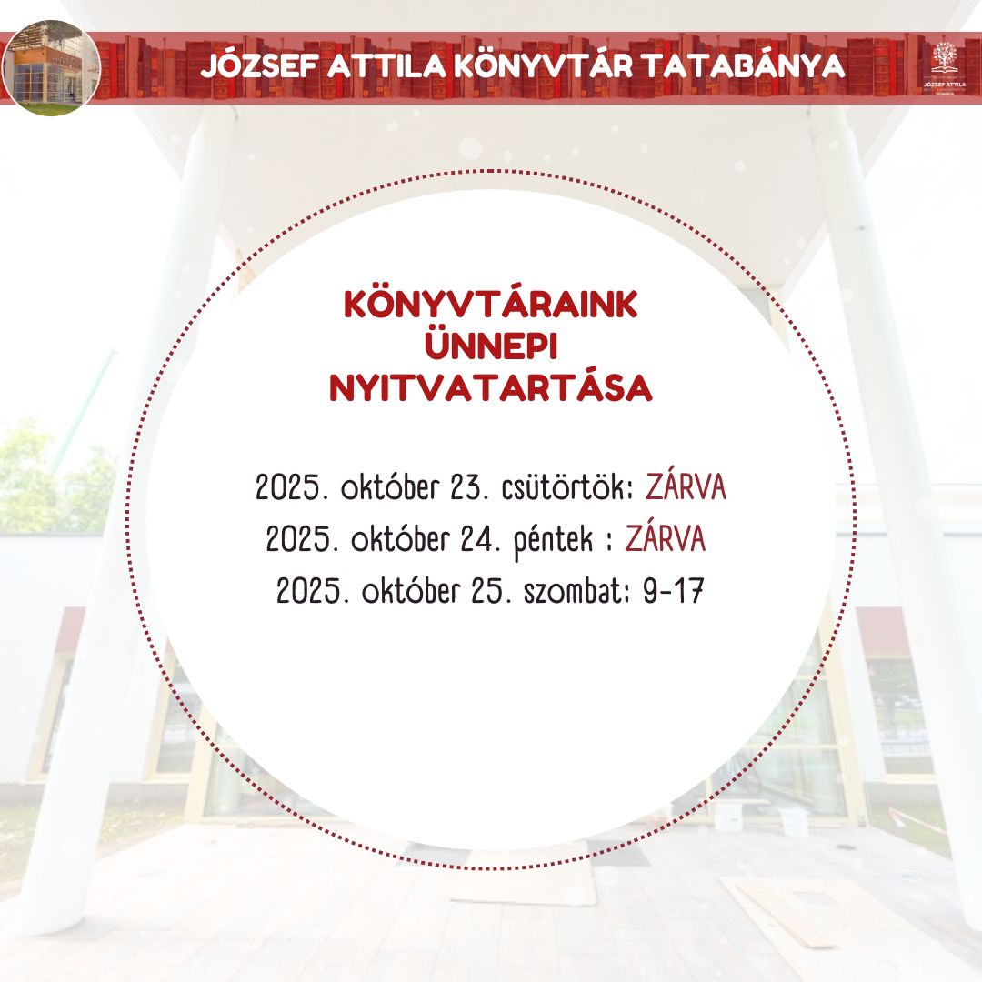 Tájékoztatjuk Önöket, hogy október 23-án és 24-én a József Attila Könyvtár valamennyi tagkönyvtára zárva tart.